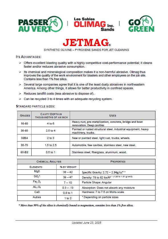 Bien que les produits Olimag ne constituent pas des matières dangereuses, il est fortement recommandé de porter des équipements de protection (gants, lunettes, protection respiratoire) lorsqu’ils sont utilisés en jet de sables abrasif pour nettoyage (sandblast) |